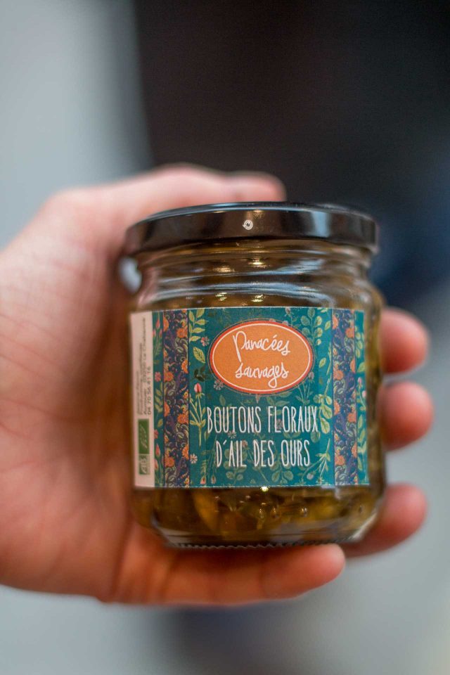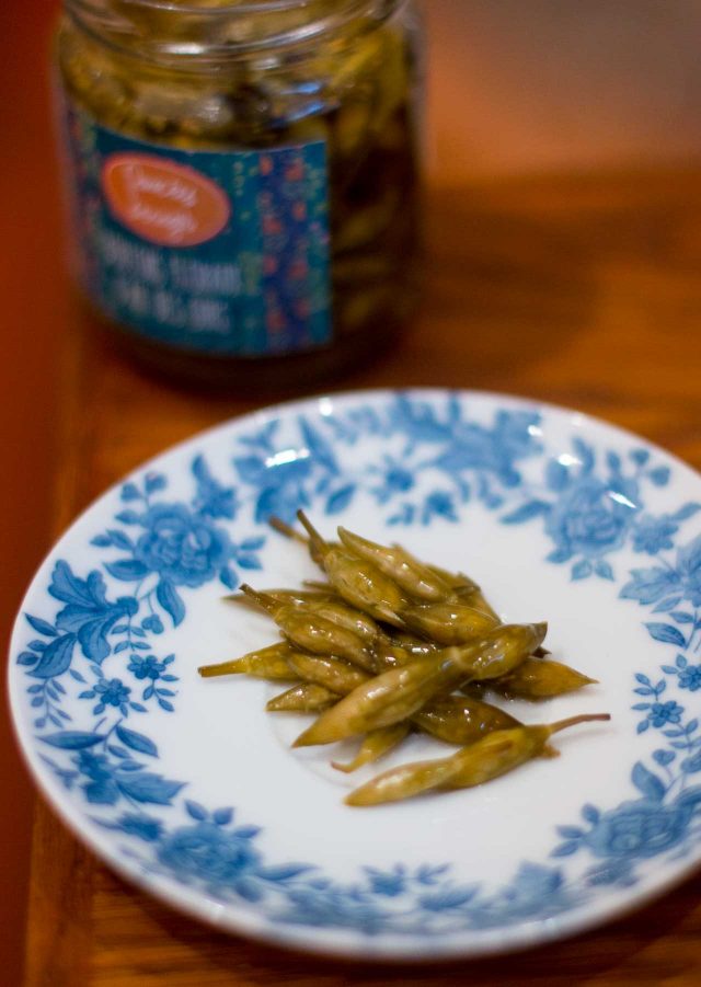 One particular curiosity to me on the shelves were these perky pods (below) of ail dโours (bearโs garlic, similar to ramps). I make a super-garlicky pesto out of the leaves when I find them fresh, but these pickles made from the flower buds were vinegary and sharp, which tames the garlic, but just a little.