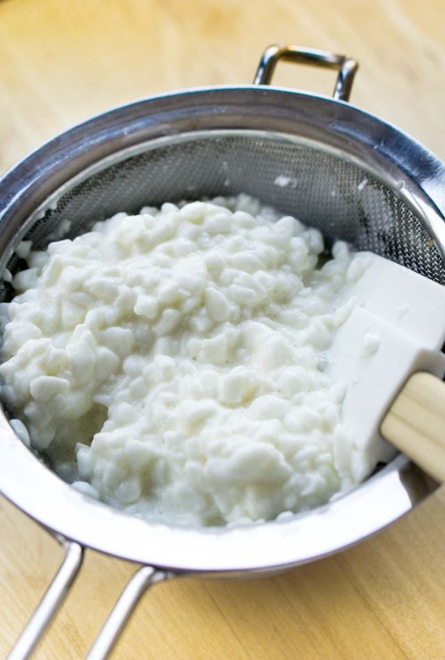 - Line a strainer with cheesecloth or etamine, and set it inside a large bowl. Pour the mixture into the cloth and stir it gently to drain off the copious amount of whey. (You can use it in bread making or in soups in place of water.)