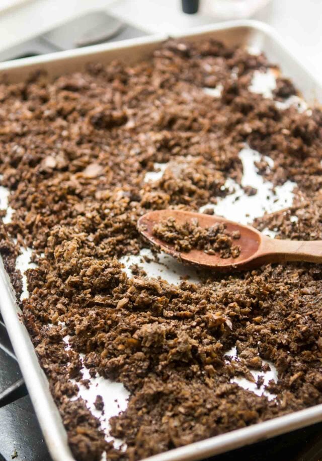 - To prepare the mushroom ragรน (the lasagna filling), preheat the oven to 425ยบF (220ยบC) and set a rack on the top third of the oven. Working in 3-4 batches, chop the fresh mushrooms in a food processor (or by hand) until they're finely chopped. (No need to clean the food processor as you'll be using it again shortly.) Spread the mushroom pieces on a large baking sheet and drizzle with 3 tablespoons olive oil and 1 teaspoon of salt. Mix them together with clean hands, then spread in an even layer. Roast in the oven, stirring the mushrooms three times during baking, until they are dark, well-reduced, and slightly crisp, about 35 minutes.