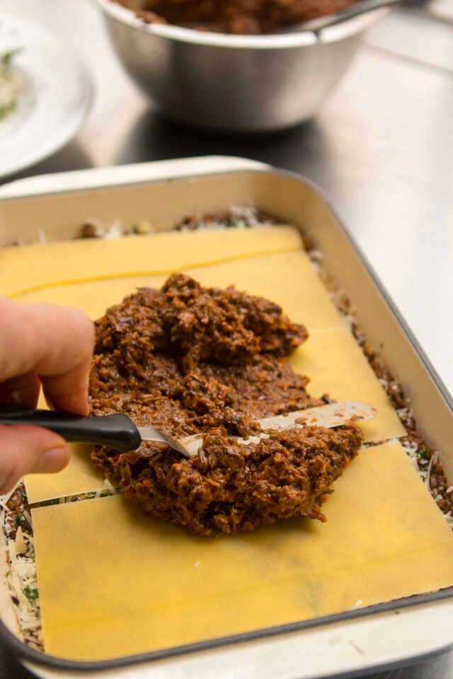 - Spread one-fifth of the mushroom ragรน in the bottom of the baking dish. Sprinkle one-fifth of the cheese and herb mixture over the top. Place a layer of the lasagna noodles over the cheese, breaking any noodles to fill in any gaps. Continue to assemble the lasagna, repeating those three steps in that order, so you end up with five layers of sauce and cheese, and four layers of pasta.