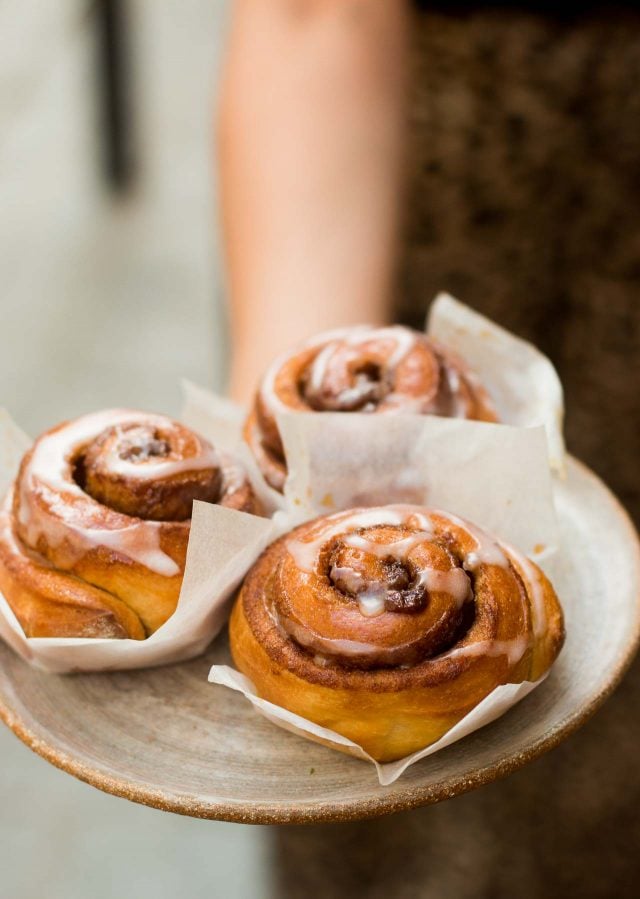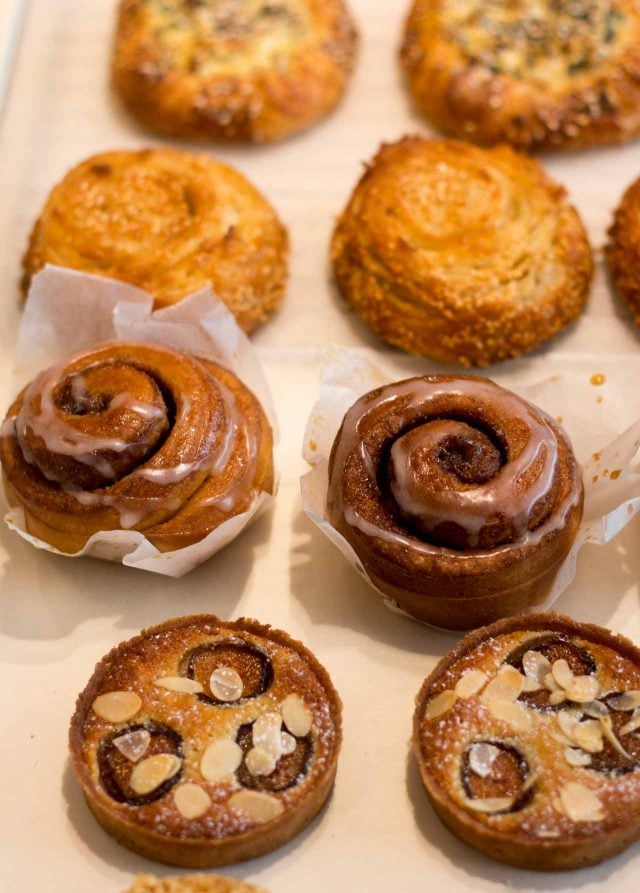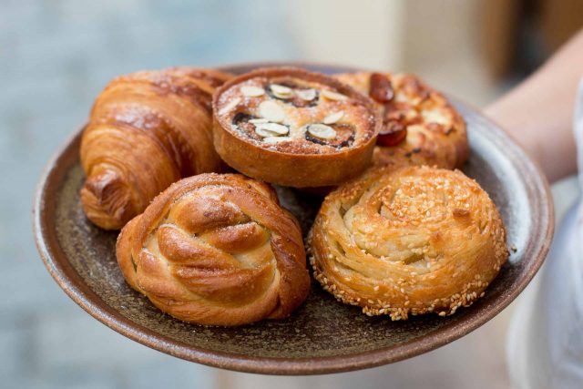 On the sweet side, the pastries riff on classics; rolling sesame seeds inย Kouign amann; adding a dusting of cinnamon to buttery brioche, and fresh figs roasted atop Bakewell tarts, layered with jam and frangipane.