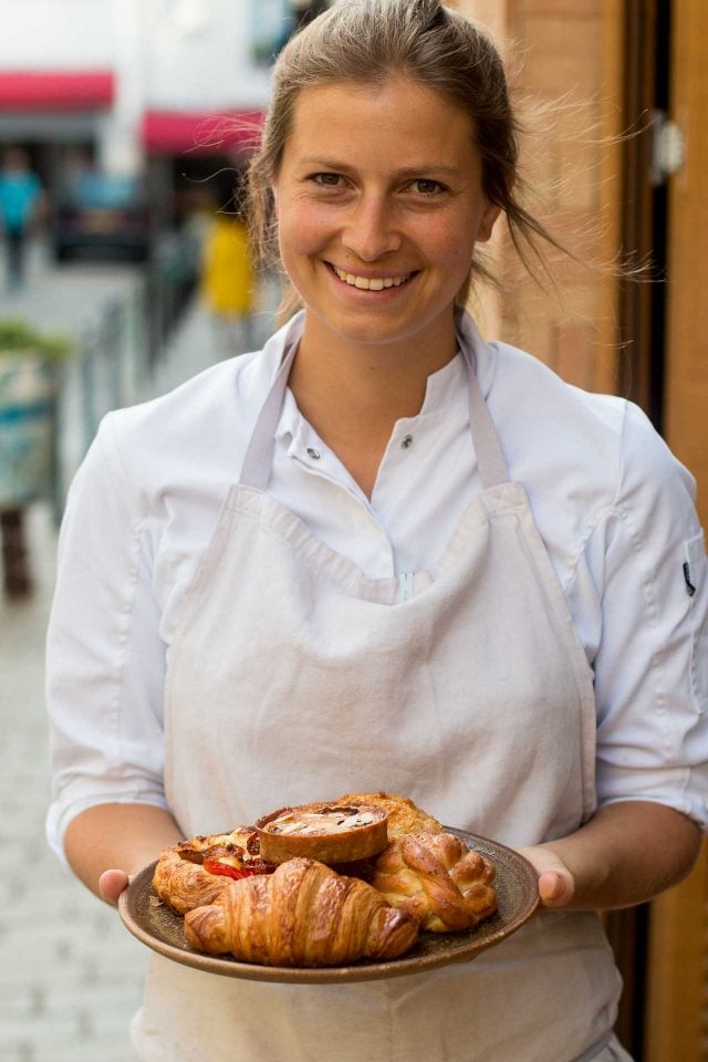 In charge of the pastries is Diana Bush. She works with Edward to decide whatโs on offer in the bakery case, which includes a number of pastries topped with tomatoes and chรจvre, roasted eggplant, and mini focaccia, for savory snacking.