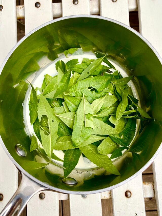 • Use a strainer or slotted spoon to skim the lemon verbena from the cream & milk mixture and squeeze the leaves to extract as much liquid as possible back into the saucepan, then discard them. Rewarm the lemon verbena-infused cream & milk.