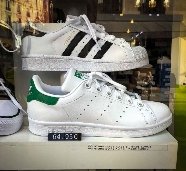 Fast forward to right now and the ne plus ultra of sneakers in Paris have been Stan Smiths, which I began wearing when I was twelve years old. Parisians are starting their kids off the same way and Iโve seen families of four, marching down the overly trendy rue de Bretagne on a Saturday afternoon, each adult and child wearing the classic white tennis shoes with the signature forest green labels trailing behind them.