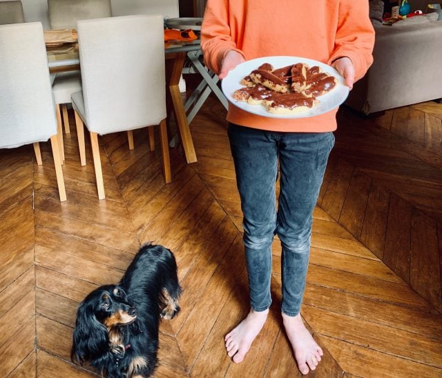 Taking out our dog, Noisette (Hazelnut),ย has become much more appealing as it allows both of us a few minutes of fresh air, although we need to fill out a little form (as directed by the government) and carry it with us each time we go out in case we are stopped by the police. She is the real winner in all this (along with lots of other dogs), so happy that her family is home all day, staying put for once.
