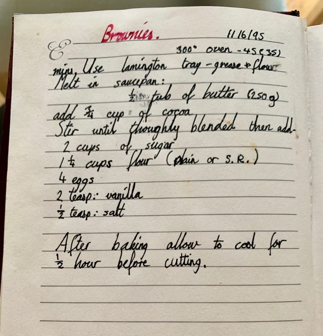 I have been making this brownie recipe since I was 8 years old, when a family friend passed it to me on a scrap of paper (above.) It is very forgiving, so if you only have self-raising flour, use that. No vanilla? No problem. Add in chocolate chips, swirl in some Nutella, omit the cocoa powder (just add another ยฝ cup/70g of flour) or scatter white chocolate chips or raspberries (fresh or frozen) on top. It is such a basic recipe that it can be easily adapted.