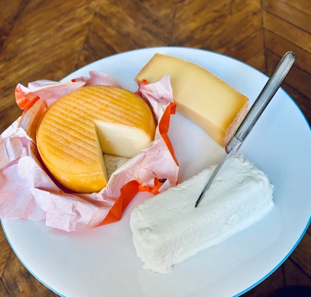 We eat together at 1pm and 7:30pm and our daughter gets to decide whether the cheese course will be served after lunch, or aprรจs dinner. We are currently enjoying an aged Comtรฉ, a soft goatโs milk cheese, and Port Salut (a mild, smooth, semi-soft pasteurised cowโs milk cheese from the Loire available in most french supermarkets).ย