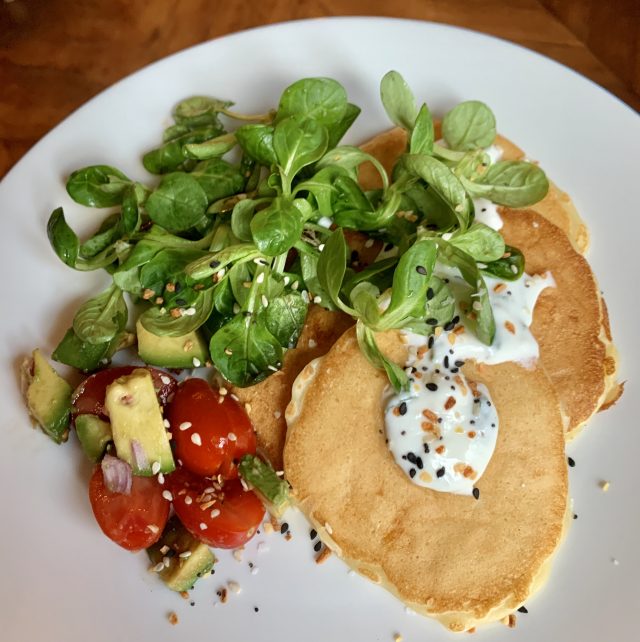 These are little pancakes that we make in Australia and again, the recipe is very flexible. We used to make the sweet version all the time as kids, for breakfast, an after school snack or anything in-between. You can add chocolate chips, blueberries (fresh or frozen), or mix in one whole mashed banana or some shredded coconut. Alternatively, keep them savory by leaving out the sugar and adding some crumbled soft goatโs cheese or some ricotta (we used a 250g tub). This evening we doubled the mixture, added a small tin of corn to the batter before cooking and had them with a salad and some yoghurt with mint chopped through for dinner.