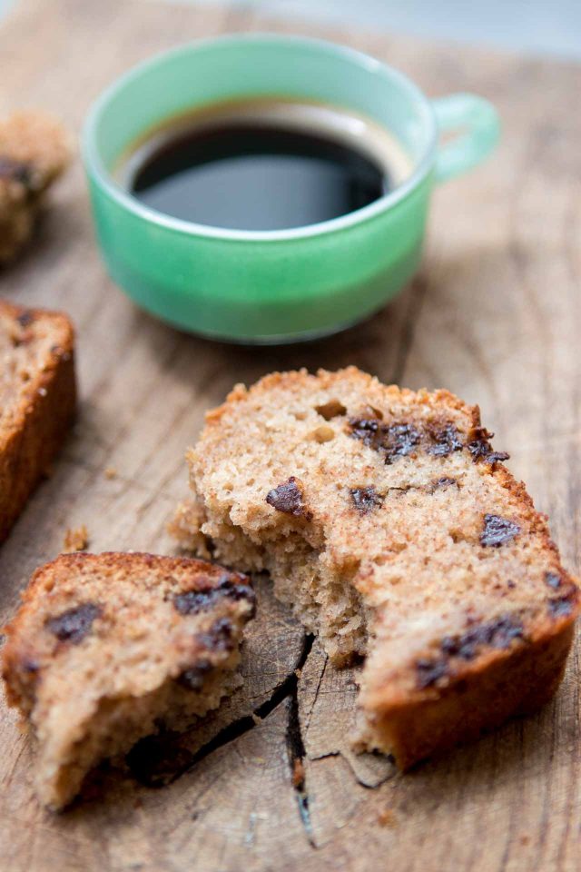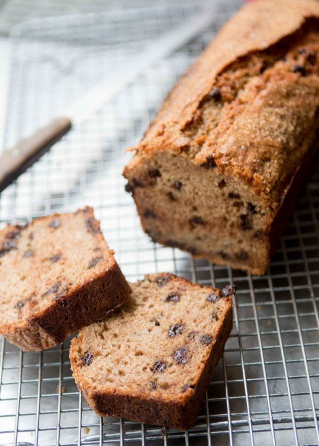 I did get to put my precious chocolate chips to use in this bread. Since chocolate chips are designed not to melt, and hold their shape when baked, they worked really well in this banana bread.