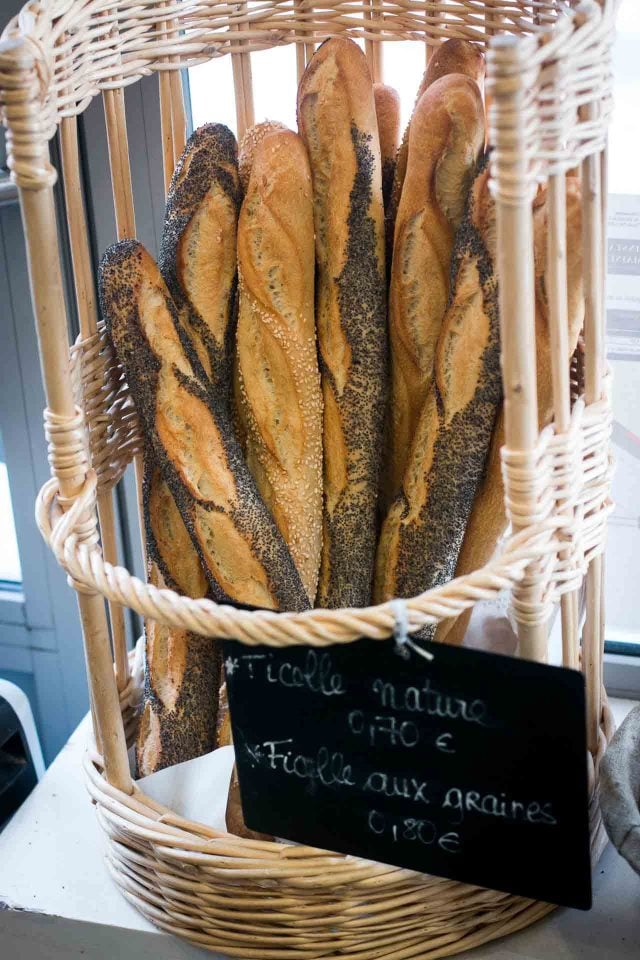 The bakery makes several types of baguettes in addition to the baguette ordinaire, which is regulated and must contain only flour, yeast, and salt, and donโt last very long. There are baguettes de tradition, baguettes de campagne, baguette aux graines (below), twisted baguettes, and baguettes coated with sesame and poppy seeds in their bakeries, the last two only available in certain shops, and the first two using natural yeast. I always go for the baguette de campagne.