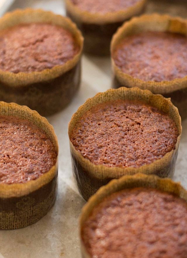 - Pour the batter into the 8 molds, which will fill them a little more than halfway up. Bake the cakes until they are deeply bronzed across the top, 35 to 40 minutes. The cakes need to be well-baked, or as Jessica says, "...almost overbaked - in order to soak up the filling."