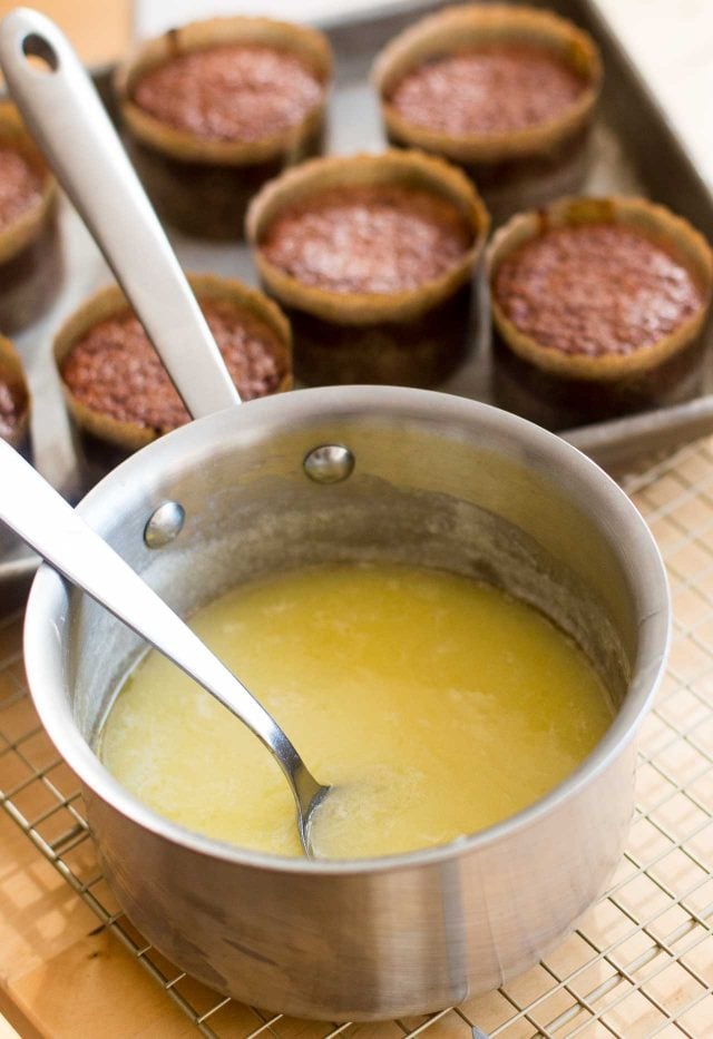 - While the cakes are baking, heat the cream, sugar, butter, and water, whisking gently, until the butter is melted and the mixture is smooth. Keep warm while the cakes are baking, or rewarm right before filling the cakes. (I found it easiest to transfer the hot filling to a measuring cup, for pouring in the next step.)