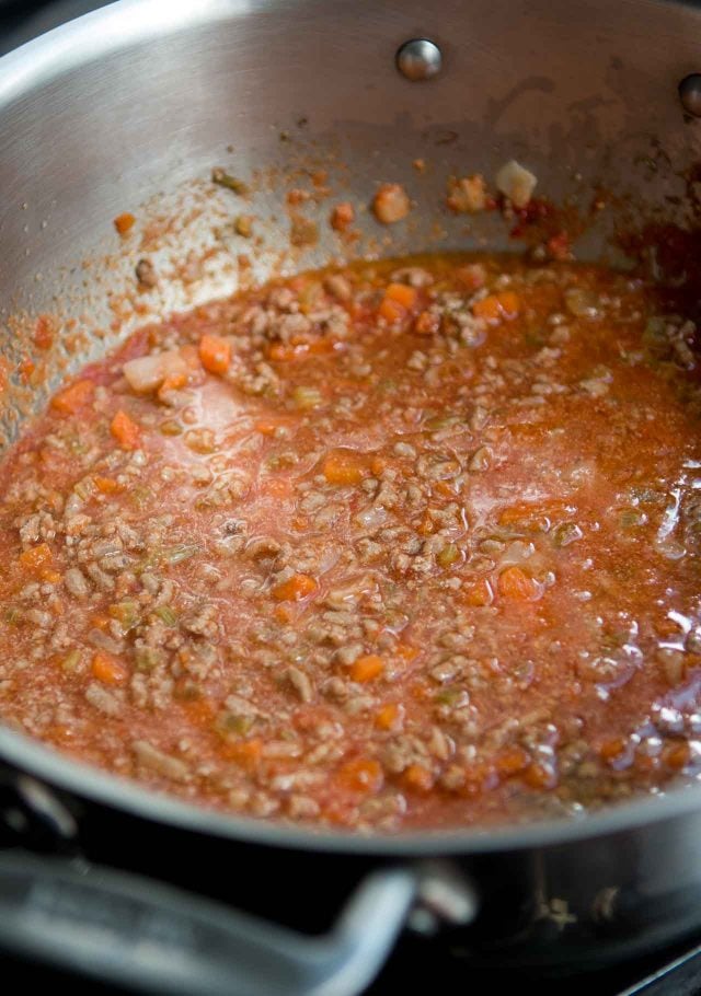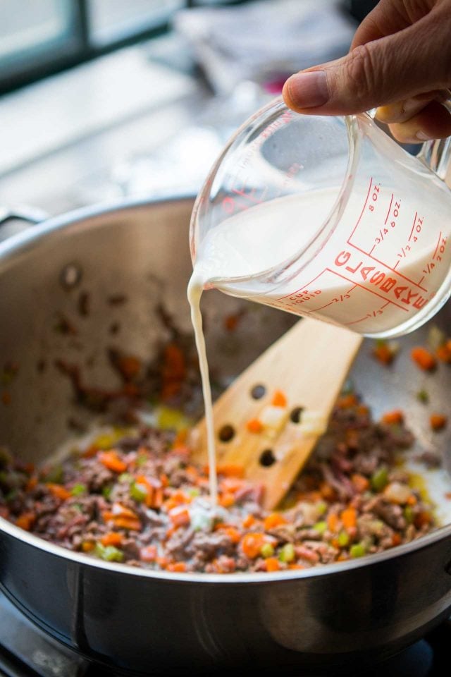 - Add the ground beef, salt, and some freshly ground pepper. Lower the heat to medium and cook, stirring, until the beef is no longer raw on the outside. Pour in the milk, and cook at a steady simmer, stirring occasionally, until the milk is absorbed. Add a dusting of nutmeg and the wine, and continue to cook until the wine is mostly absorbed. (These steps can take a bit longer than you think, maybe 10 to 15 minutes of so, but this isn't a sauce to be rushed.)