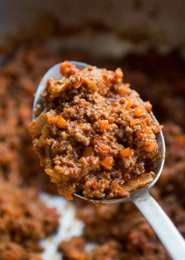 Being Italian, Marcella certainly had strong opinions, too. She railed against the overuse of garlic that she felt unbalanced a dish, and used more butter than any Italian cook would. Her famous tomato sauce has only four ingredients, and one of them is 5 ounces/140g of butter. I havenโt made that but Iโve heard itโs a life-changing tomato sauce. (And frankly, life-changing sounds good right about now.) Marcella was fond of butter and also used it in her Bolognese.