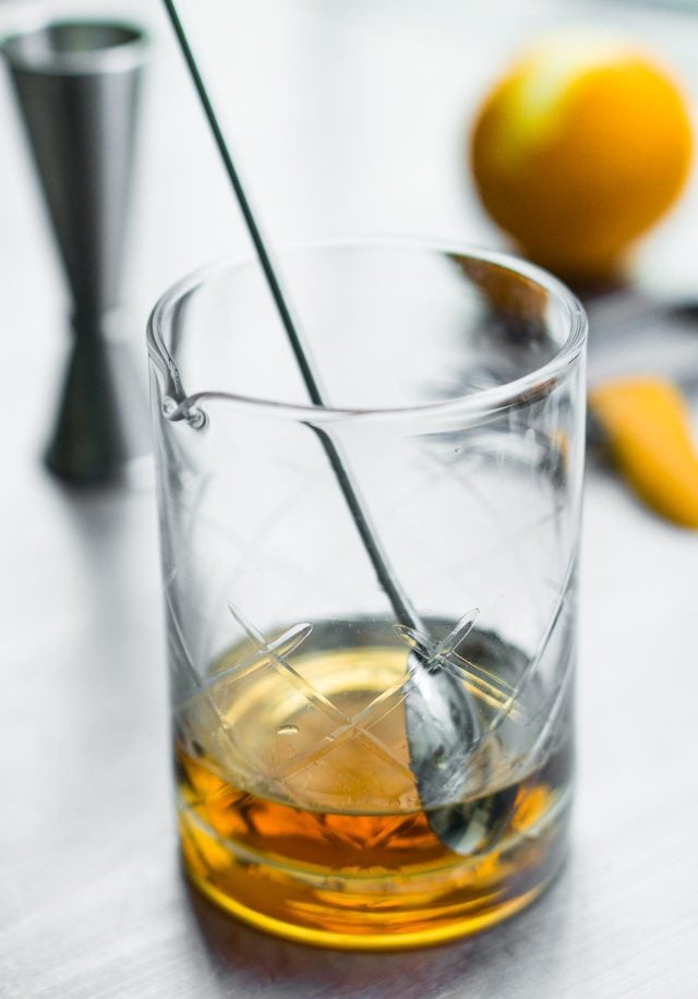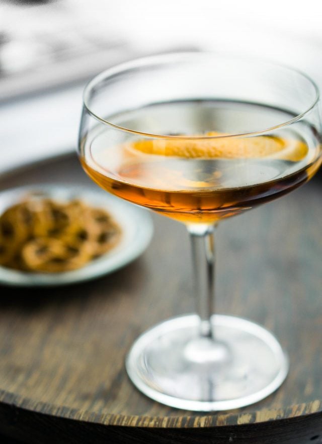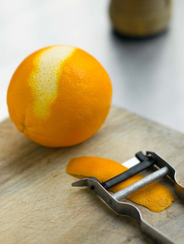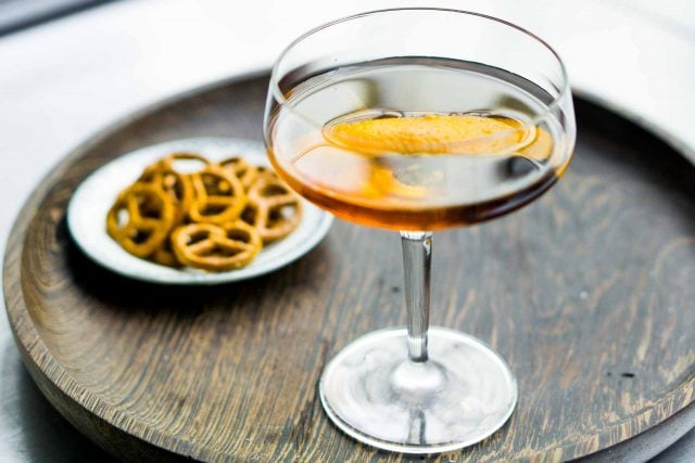 - Strain into a chilled cocktail glass. Twist a strip of orange zest over the top, drop it in, and serve.