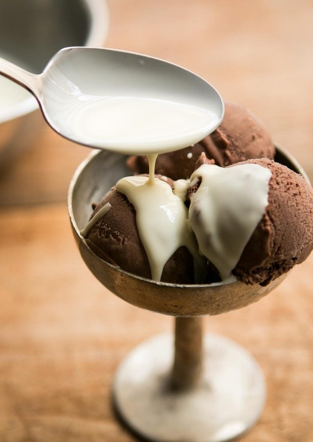 No need to leave a comment saying that you donโt like white chocolate because itโs not โrealโ chocolate. No one is saying it is. (Unless thereโs something going on out there that no one is telling me about.) I donโt compare white chocolate to dark chocolate and think both have their place, like in the bowls I served up at home, where I spooned mint-flavored white chocolate coating over scoops of dark chocolate ice cream, giving me the best of both cocoa-colored worlds. Who can argue with that?
