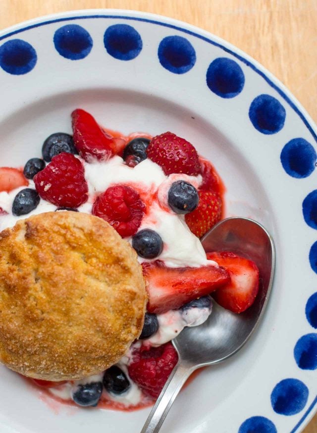 On the upside to the unpleasantries that day, I scored several baskets of strawberries at the market that morning, that were very ripe, to the point of where they wouldnโt have lasted another day. Thatโs often when fruit tastes the best, and with a use-it-or-lose-it mentality that haunts me whenever I have good fruit in my kitchen, I decided to make a batch of Mixed Berry Shortcakes. I also had some artisanal butter on hand that had a slight funk to it, that I wasnโt sure what to do with. I normally donโt mind that kind of thing โ animal products that arenโt industrial sometimes have that flavor, which wasnโt so terrific tasting first thing in the morning on my toast. So I used it to make the shortbread biscuits.
