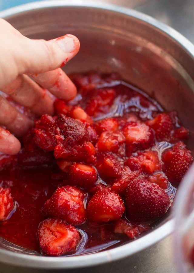 - Put half the strawberries in a medium bowl with 1 1/2 tablespoons of sugar and 1 teaspoon kirsch, if using. Use your hands to mash everything together until the berries are juicy. Set aside for at least 30 minutes. You can stir the berries a few times as they sit, which will encourage them to release more of their juices.