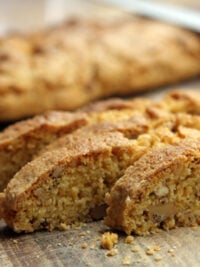 - The biscotti are done when they are gently browned on each side and feel dry on both sides when you touch them. Remove from oven and let cool completely.