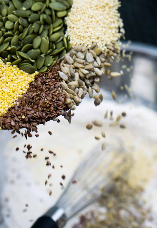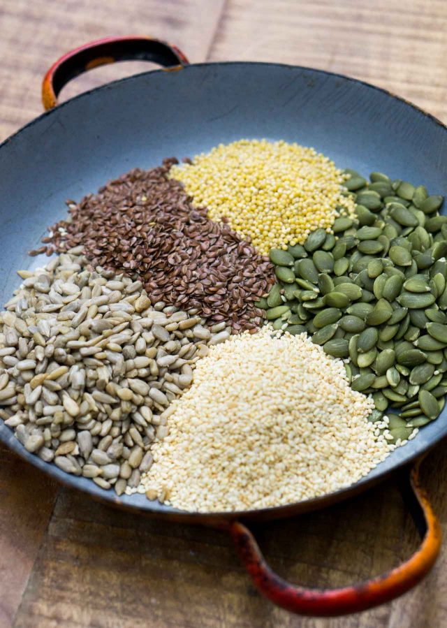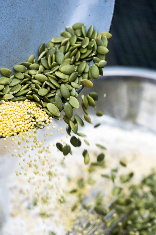 - In a large bowl, whisk together flour, cornmeal, sugar, cinnamon, baking soda, salt, and a few turns of freshly ground black pepper. Stir in the almonds, pumpkin, sunflower, and sesame seeds, as well as the flax seeds, and millet.
