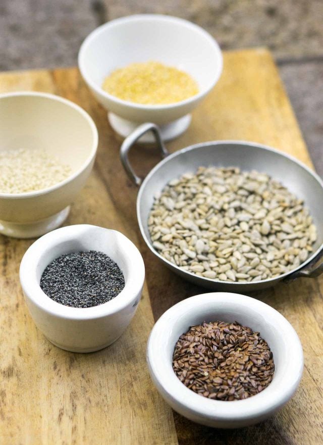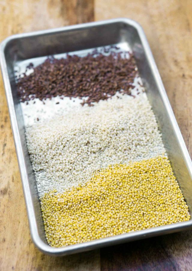 - 1 1/2 tablespoons (each), sesame seeds, flax seeds, millet, and poppy seeds