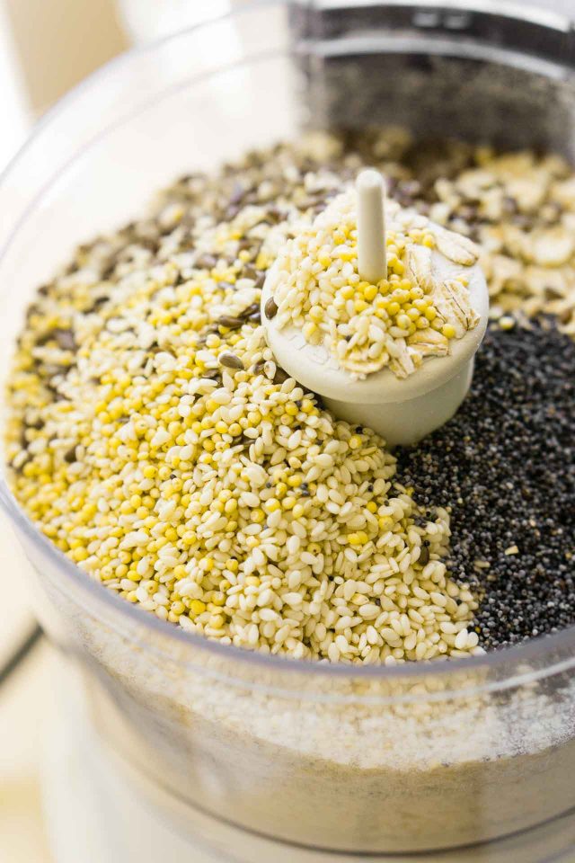 - To the bowl of a food processor, add the sunflower seeds, wheat germ, all-purpose and whole-wheat flours, baking powder, baking soda, and salt. Process until the mixture is pulverized. Add the oats, millet, sesame and flax seeds, and poppy seeds to the bowl of the food processor and pulse a couple more times, just enough to combine everything, but no further.