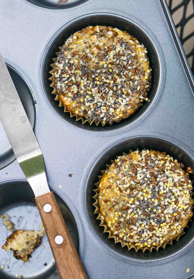 - Line a 12-cup (or two 6-cup) muffin pan(s) with paper baking cups, or butter the indentation. Mix the four seeds in the 4-seed topping together in a small bowl. Sprinkle 1/2 teaspoon of the seed mixture into each baking cup.