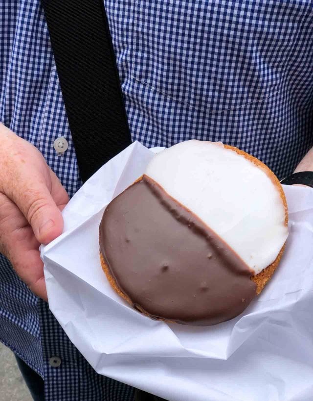 My search for a great Black & White cookie led me here. (Thereโs a recipe for them in my book, Ready for Dessert.) AT the Donut Pub, doughnuts are made with everything, from salted butter caramel to bacon, which lined the shelves and are featured in the window. But I was there for the Black & White. The cookie was HUGE; literally big enough to feed four. It was quite thick, and a good one. But if they made them thinner, which would tilt the ratio of icing to cookie more in favor of the frosting, I probably could have finished it off by myself. A big plus was the terrific salesperson, who kept calling me โhoney.โ (203 West 14th Street.)