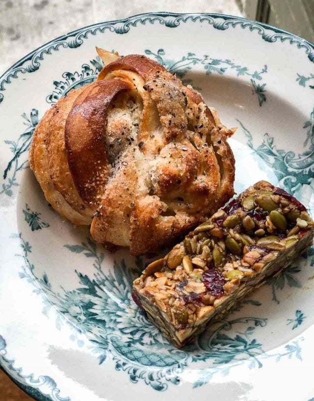 Sweden has also planted a bakery flag in New York at Fabrique. The knotted cardamom rolls (above) were delicious but I was really into the granola bar; a solid block of seeds and grains, with dried cranberries providing some tartness. A little off-the-beaten-track, with a line up of nice-looking breads and croissants (shown at the top of this post), this is exactly the kind of bakery you want in your neighborhood. Itโs no secret, though; according to Eater, they have 20 locations in Stockholm and five in London. (348 West 14th Street.)