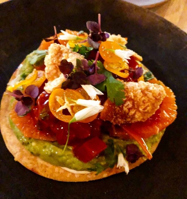 This may be my favorite restaurant in the U.S. right now. If I told you that it has a Michelin star, you might be tempted to blow it off. But donโt. Mexican food is one of the great cuisines of the world, and the food at Claro! is rooted in Oaxaca. I started off with a mezcal-like cocktail made with Estancia Raicilla, which canโt be called mezcal due to geographic designations, but its similar smokiness lent an alluring backbone to my cocktail. The star dish of the night was the Yellowfin tostada (above) with Cara Cara oranges, kumquats, pasilla chile, and chicharrรณn (crunchy pork skin) on a housemade tortilla. The wild mushroom memela with goat cheese, epazotรฉ and pasilla was also superb; the especially engaging waitress nodded vigorously when we ordered it. This isnโt a taco joint but itโs not fancy either, hence my apprehension about touting its Michelin star. Although itโs tempting to order everything on the menu, the food is quite filling so just remember, you can always go back. (284 3rd Avenue, Brooklyn.)