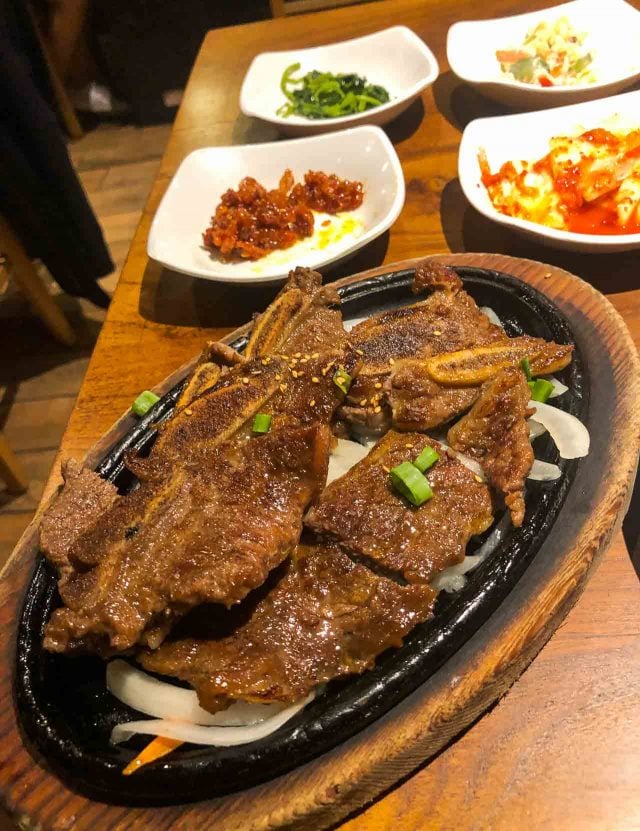 While I like Miss Korea (warning: their website opens with music, which scared the kimchi out of me), and itโs fun to hit the salad bar-style Woorjip for a quick Korean bite, I think itโs good to mix things up in life, and hit The Kunjip for lunch. Lunch menus in Koreatown offer bargains and my Kalbi beef (above) was $19 and came with six banchans, soup, and an overly generous bowl of cold buckwheat noodles. The young woman next to me, who was also dining alone and wasnโt familiar with Korean dining, was startled when the server came over with a tray overloaded with side dishes, soup, etc. just for her, protesting she didnโt order all those things, until they explained that they were included. She didnโt eat as much as I did. I finished everything. (32 West 32nd Street.)