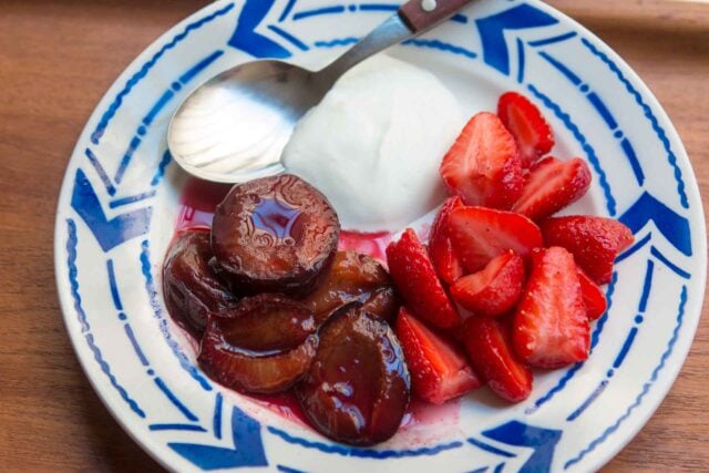 There are a lot of plums out there. In Northern California we had big purple Santa Rosa plums, as well as an array of others with names like Elephant Heart and Angelino, as well as pluots, a hybrid of apricots and plums. While they donโt show up in Paris, there are green Reine Claudes (which are close to being at the top of my list for favorite varieties of plums), tiny golden Mirabelles, and sturdy Quetsches, which hold their shape relatively well during baking. And while theyโre not as tart as U.S. varieties (most of the tartness of plums is in their skins), they are reliably good, and flavorful, when baked or oven-roasted, as I often prepare them.
