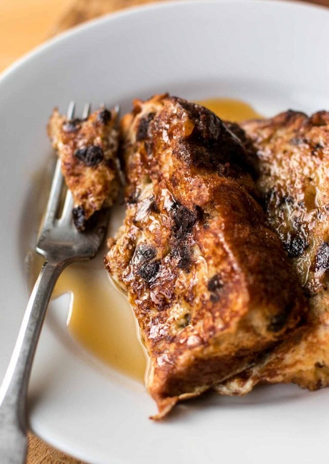 - In a wide, shallow bowl, beat the eggs, milk, vanilla, cinnamon, and salt together with a fork until well-combined. Place the slices of bread in the custard and gently press them down to help the bread absorb the custard, then turn them over the do the same to the other side of the bread.