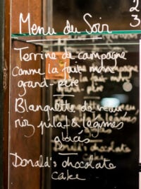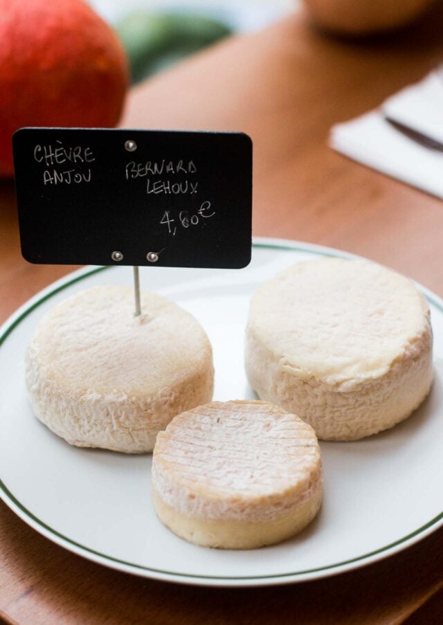 As part of an initiative in France to let people know the restaurant they were dining at cooked foods from scratch, the government introduced a Fait Maison symbol a few years back to assure diners that they were getting what they thought they were. (No need to rifle around behind the restaurant for tell-tale packagesโฆ) But no one needs to worry at Chanceux and they donโt need any symbols or logos posted on the door; when I had lunch at Chanceux the other day, fresh produce teetered on my table, and the cheese and charcuterie cases listed where everything was from, and in some cases โ like the cheese below โ the person who made it.