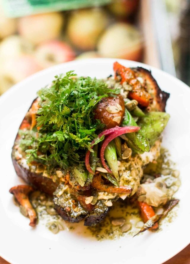 The picture I took of it doesnโt quite do it justice, so how do I say this? It was outstanding. I was surprised when I took my first mouthful and discovered the brioche wasnโt as rich or as dense as I was expecting, but was feather-light, topped with an explosion of fresh ingredients and flavors. I donโt know how she mixed so many flavors, such as roasted hokkaido (kuri) squash, pickled chiles, fresh cheese with shallots, girolles (wild mushrooms), charred leeks, buckwheat, fresh herbs, and preserved egg yolk, to work together so well, but boy, did they ever.