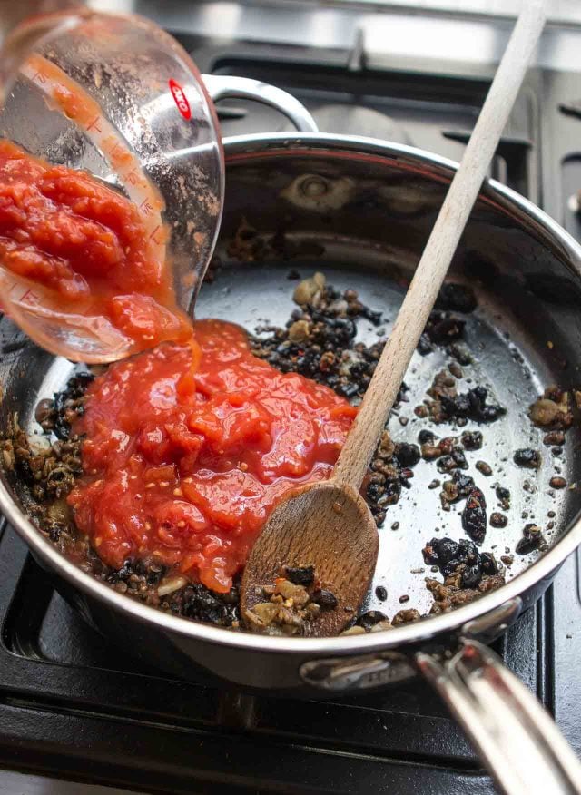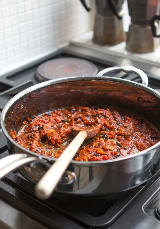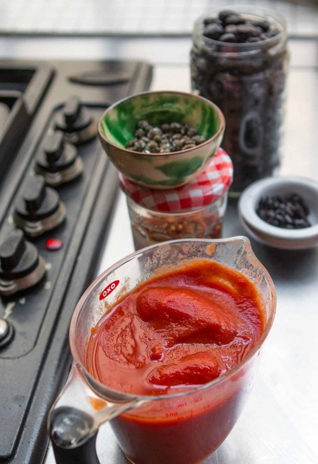 - Add the olives, capers, and red pepper flakes to the skillet, and stir for a minute, then add the tomatoes and tomato paste. Continue to cook, and stir, until the sauce is a deeper red color and the consistency of warm jam, which will take a couple of minutes. You want it wet and loose, but not watery. Remove from heat and set aside.