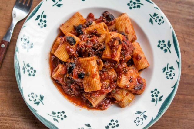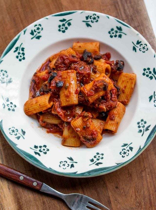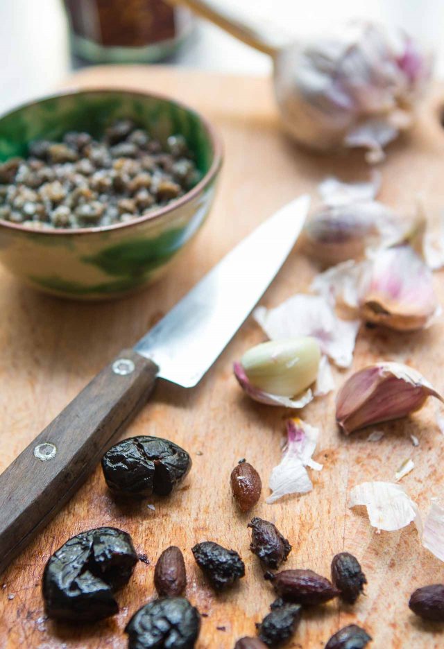 I love the smell, and taste, of everything in this dish, from oil-cured olivesย to the slivers of sizzling garlic. And I also like dried pasta. Back in the 80s or 90s, when fresh pasta became all the rage in the U.S., a lot of people turned their noses up at it. I like fresh pasta, but people eventually realized that fresh and dried pasta are two different beasts, and each has its place. Here, dried pasta works better because itโs sturdy enough to hold its own against the hearty, and hardy, ingredients in the sauce.