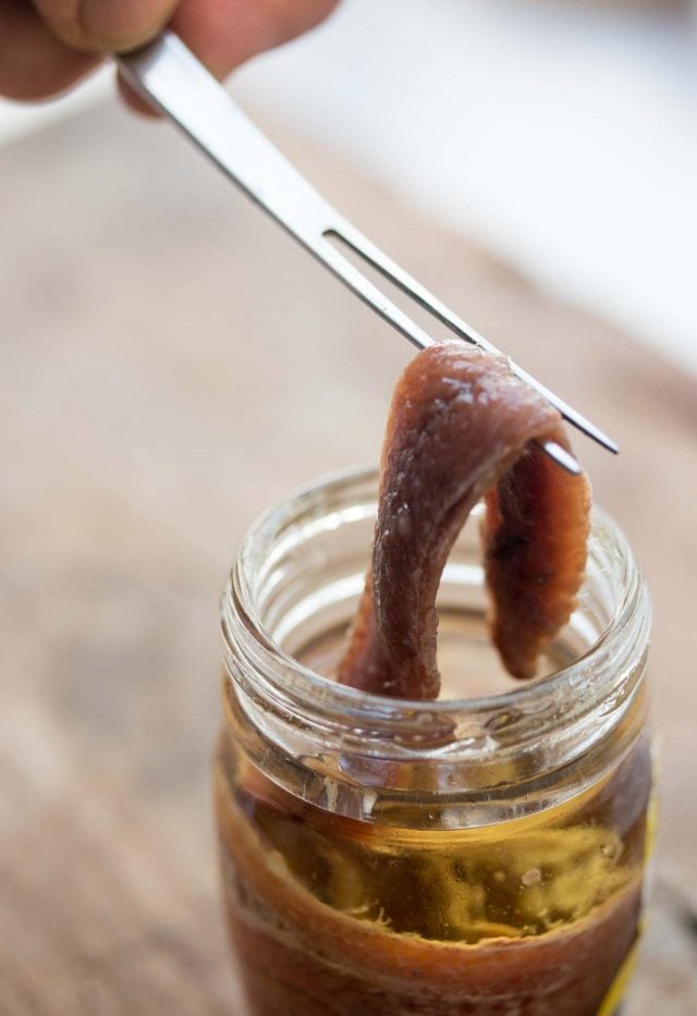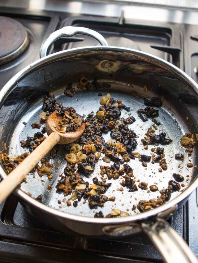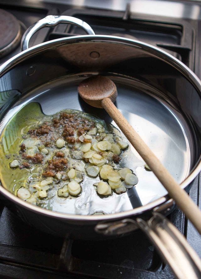 - Make the sauce by putting the olive oil, garlic, and minced anchovies in a large, wide skillet. Heat the pan over medium heat, cooking the garlic and anchovies, stirring frequently, until the garlic is lightly browned and the anchovies are very soft and almost melting, about 2 minutes. Meanwhile, heat a large pot of water to cook the pasta in.