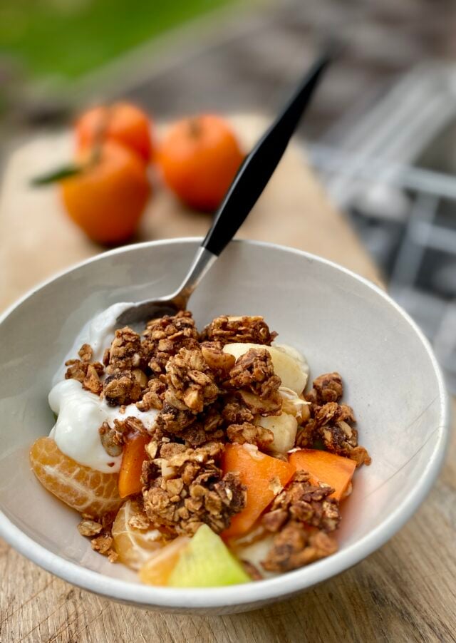 Store-bought granola is usually sad, with not enough big chunks of things to make it worth the money, although it is more convenient. However this granola doesnโt require lots of chopping and the list of ingredients is fairly short, and you likely have most of them on hand.