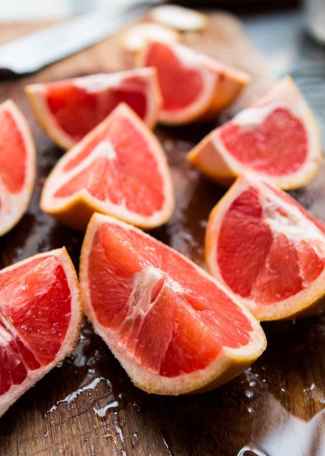 - Cut the grapefruits in half. Use a soup spoon to scrape the pulp out of four of the grapefruit halves*. Remove any seeds and coarsely dice the grapefruit pulp and scrape it, along with any juice on the cutting board, into a bowl. (If you have one of those cutting boards with a gutter to collect meat juice, those work well here, as well as in the next step.) Set aside.