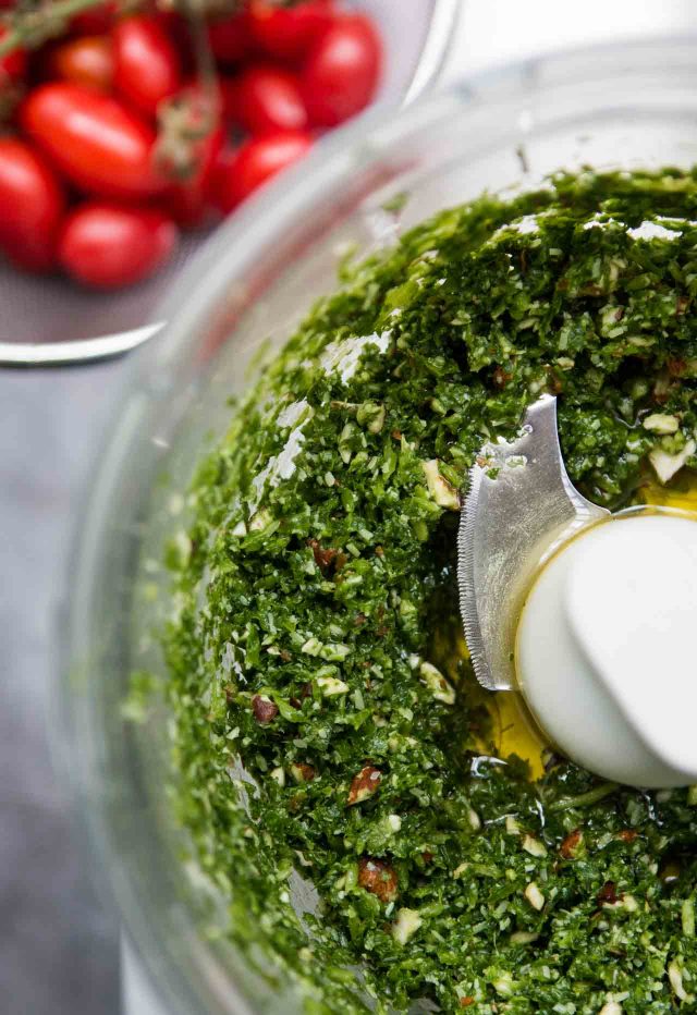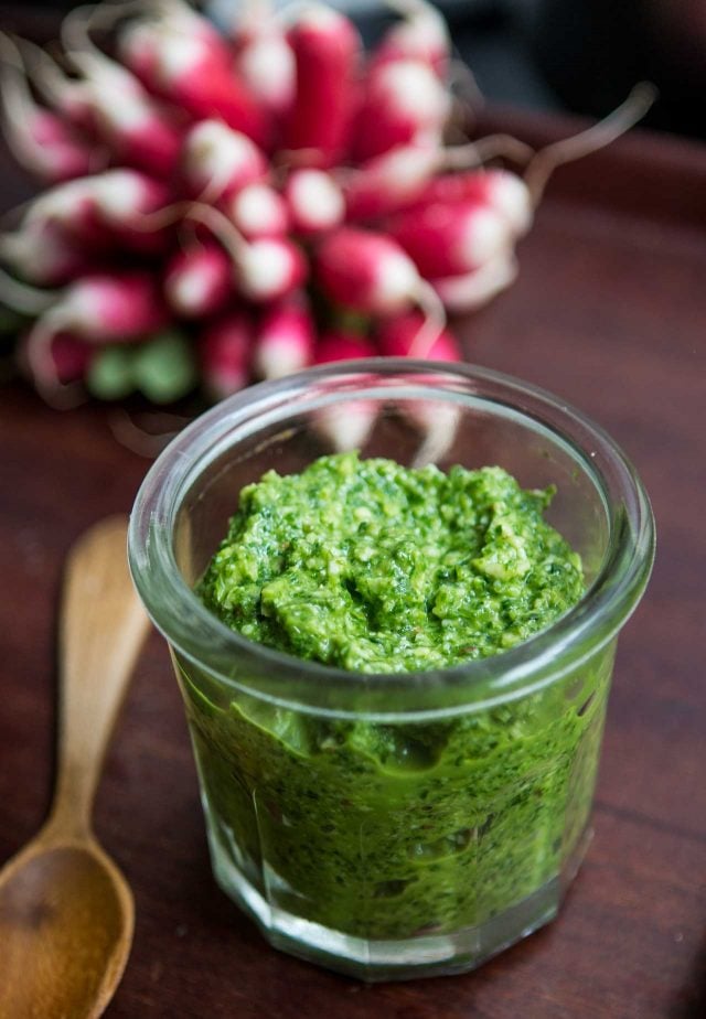 This pesto is so simple to make that you donโt have to worry about spending the afternoon making it, or cleaning up afterward. I use a food processor but you can use a blender instead. (Unlike basil leaves, radish leaves are quite firm so a mortar and pestle would require a lot more muscle.) Just add everything to the machine, and blitz away. Within a few minutes, youโll have a beautiful jar of bright-green radish leaf pesto, which is great spread on crackers or toasts for an appetizer, or tossed with noodles and vegetables, like peas, broccoli, or green beans, for a vibrant bowl of pasta. But if you canโt use it right away, yes, it can be frozenโฆif you have the space.