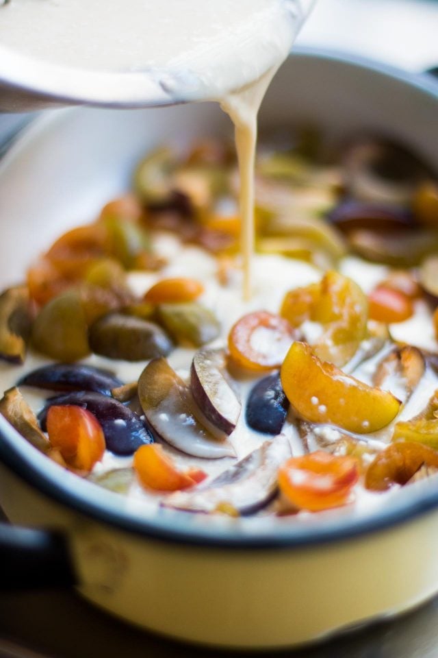 - Preheat the oven to 400ยบF (200ยบC). Generously butter a 6 to 8 cup (1,75l) baking or gratin dish, or a large pie plate. (I like to use one that's narrower, but deeper.) Strew the plums over the bottom of the baking vessel.