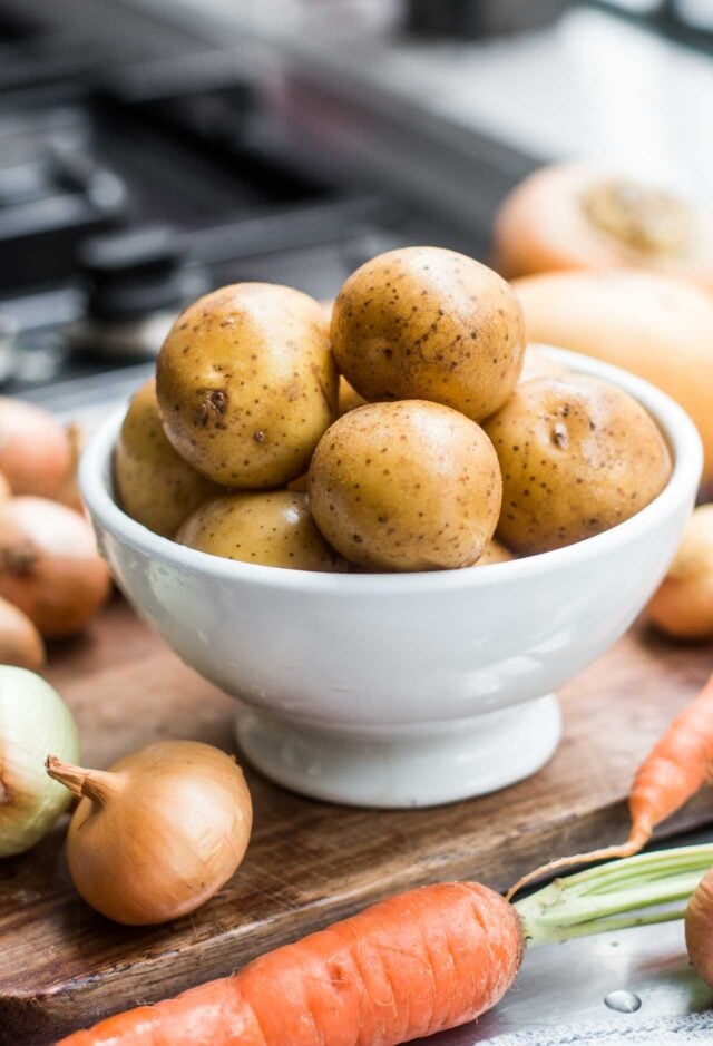 - Once browned, remove the chicken from the pot, place it on a plate, and add the onions to the pot. Cook, stirring occasionally, until browned, about 5 minutes. Add the garlic, carrots, turnip, and salt, along with some freshly ground pepper, and cook for another minute or two, stirring frequently. Put the chicken in the pot along with the bouquet garni. Place the potatoes around the chicken, tuck the parsley sprigs in next to the chicken and add the water and stock so it covers about three-quarters of the chicken. If you need more liquid, add additional water or stock.