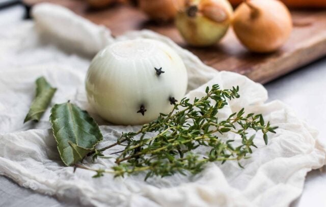 - Make a bouquet garni by studding the onion with the cloves. Wrap them in a piece of cheesecloth or muslin along with the thyme and bay leaves, and tie them in securely with twine.