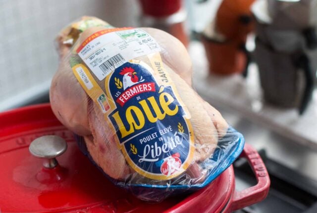 When you buy a chicken in France, they are prepared and trussed even when you get them at the grocery store, such as the one I bought above. Itโs a nice touch, but if you go to a butcher or volailleuse or volailler, they will prepare the bird for you, removing whatever you want removed, and tie the whole thing up so itโs ready to go. However for this recipe, you donโt really need to do that, so no need to work on those trussing skills. Whew!