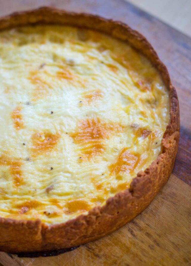 While cheese is not in the original quiche Lorraine recipe, nowadays many have cheese added. Iโve read that the original recipe was also cooked in a cast-iron pan, not in a tart pan, and was baked in bread dough, not a buttery crust. Some say quiche Lorraine also didnโt have bacon in it either. (And that it was likely invented in Germany.) I wasnโt around in the 16h century when quiche Lorraine was invented so canโt say for sure but food evolves and changes with the times and tastes.
