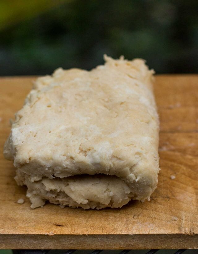 - Add the ice water and vinegar and continue to mix (or pulse a couple of times) just until the dough comes together. Turn the dough out onto a very lightly floured countertop and gently pat the dough until it's in a rough rectangle about 1-inch (3cm) thick. Fold the dough over in half, then repeat two more times, patting the dough out until it's 1-inch/3cm thick and folding it over in half, for a total of three times. Wrap the dough in plastic or an eco-friendly alternative, and refrigerate for at least 1 hour. (The dough can be refrigerated for up to three days.)
