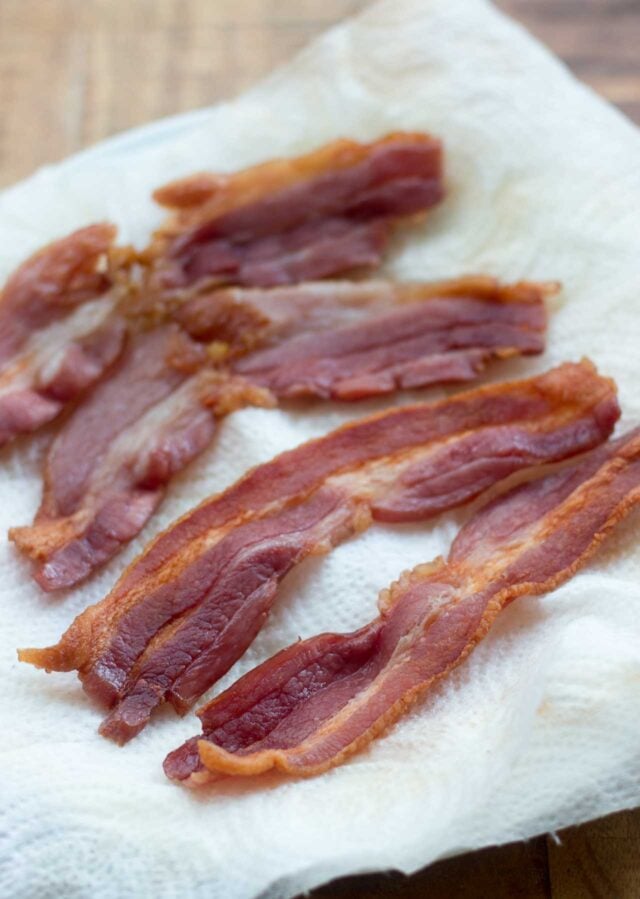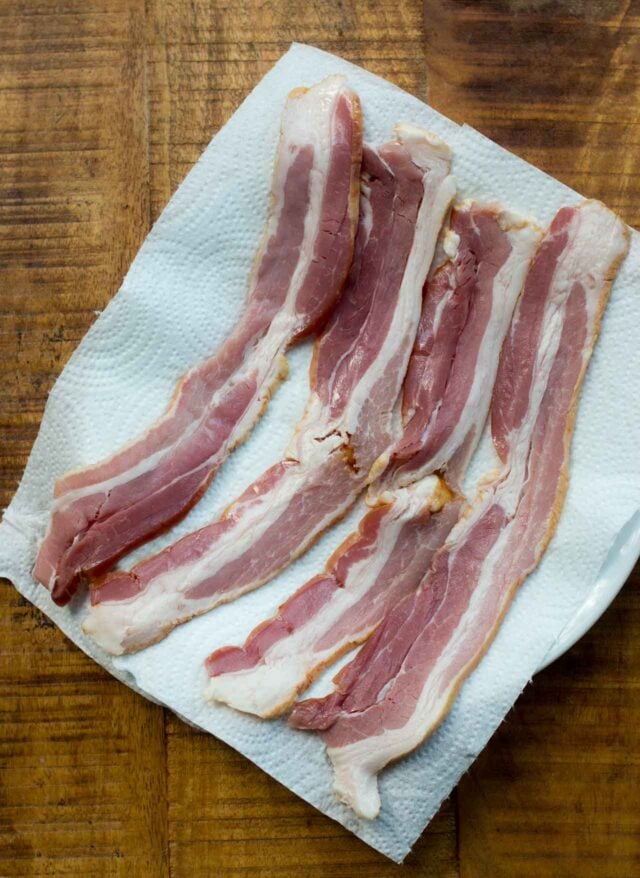 - To make the filling, place the bacon on a dinner plate lined with paper towels. Place a paper towel over the bacon and cook in the microwave, turning the bacon over midway during cooking, until it's cooked through and relatively crisp. (The French don't usually crisp bacon, but prefer it on the chewy side.) Thick-cut bacon will take about 6 minutes. (If you use thin bacon, reduce the cooking time.) Uncover and let cool.