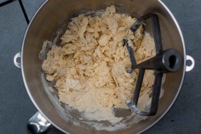 - To make the dough, in the bowl of a stand mixer fitted with the paddle attachment, or in the bowl of a food processor, mix the flour, sugar, and salt. (The dough can also be made by hand in a bowl using a pastry blender.) Add the pieces of butter and mix on low/medium speed, or pulse, until the butter is in pea-sized pieces. If using a food processor or pastry blender, pulse it in the processor just a few times (or mix with the pastry blender) until the butter is in irregular dried chickpea-sized pieces.