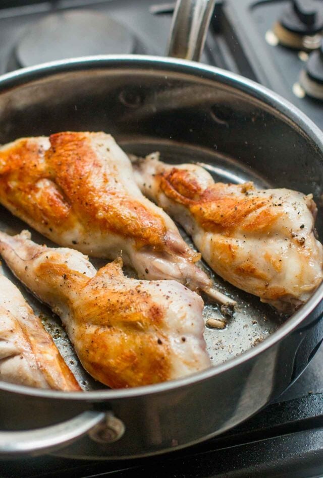 - Season the rabbit thighs with salt, piment d'Espelette or paprika, and black pepper. Heat the duck fat or olive oil in a Dutch oven that (hopefully) will fit them in a single layer, without crowding. (Otherwise you can brown them in a large skillet or in two batches, then add them to the pot later.) Add the thighs to the pot and let brown well on one side before turning them over and browning them on the other side. It'll take a total of 10 to 15 minutes.